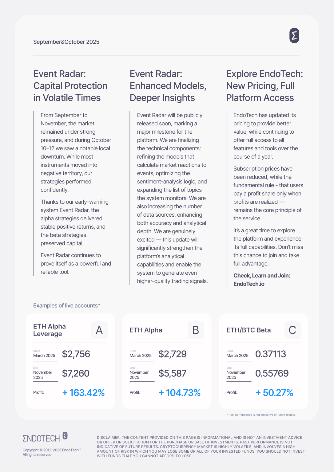 From September to November, the market remained under strong pressure, and during October 10–12 we saw a notable local downturn. While most instruments moved into negative territory, our strategies performed confidently.